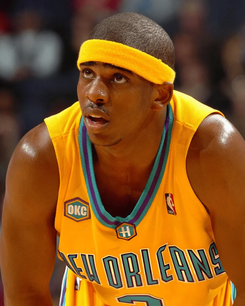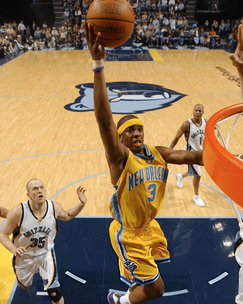 “新秀克里斯-保羅戴著頭帶上場(chǎng)打比賽??,球衣2006年1月28日對(duì)陣灰熊。照片”