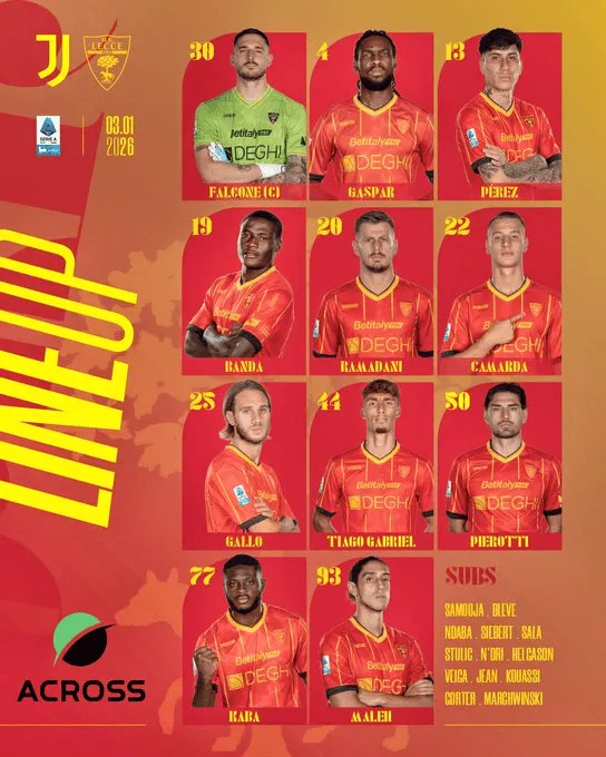 萊切首發(fā):30-法爾科內(nèi)、4-加斯帕、13-佩雷斯、19-班達、10-拉馬達尼、22-卡馬爾達、25-加洛、44-加布里埃爾、50-皮耶羅蒂、77-卡巴、93-馬勒