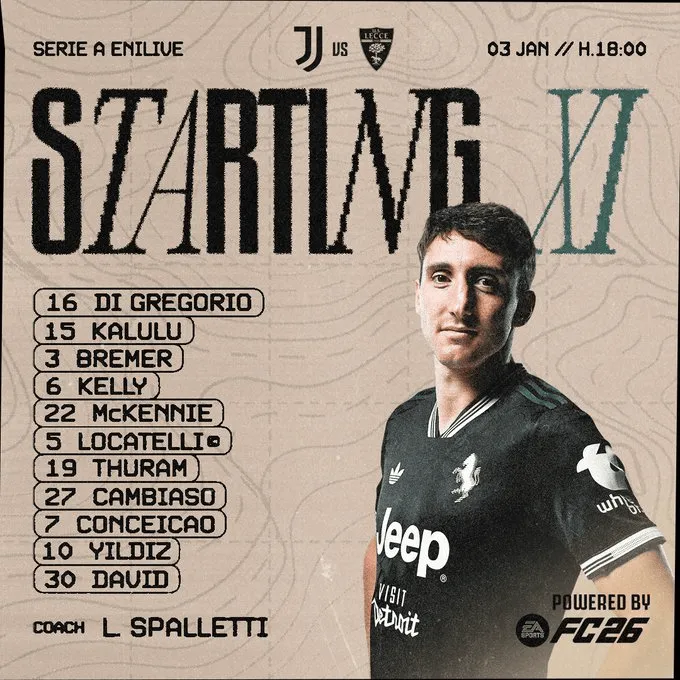 尤文首發(fā):16-迪格雷戈里奧、15-卡盧盧、3-布雷默、6-凱利、22-麥肯尼、5-洛卡特利、19-凱夫倫-圖拉姆、27-坎比亞索、7-孔塞桑、10-伊爾迪茲、30-喬納森-戴維