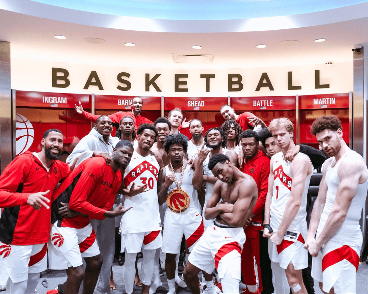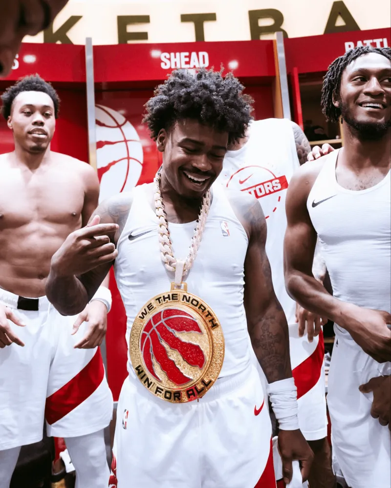 賽后猛龍官媒更新了X,拍全曬全隊在更衣室拍攝全家福慶祝勝利,家福賈馬爾-謝德獲得本場最佳球員的慶祝大金鏈子。
