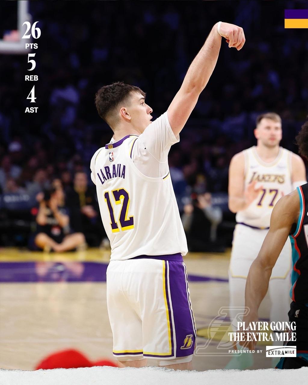 本場比賽,人賽湖人球員拉拉維亞出戰(zhàn)34分鐘,后分投籃16中9、享拉獻(xiàn)分三分10中4得到26分5籃板4助攻1搶斷。亞數(shù)