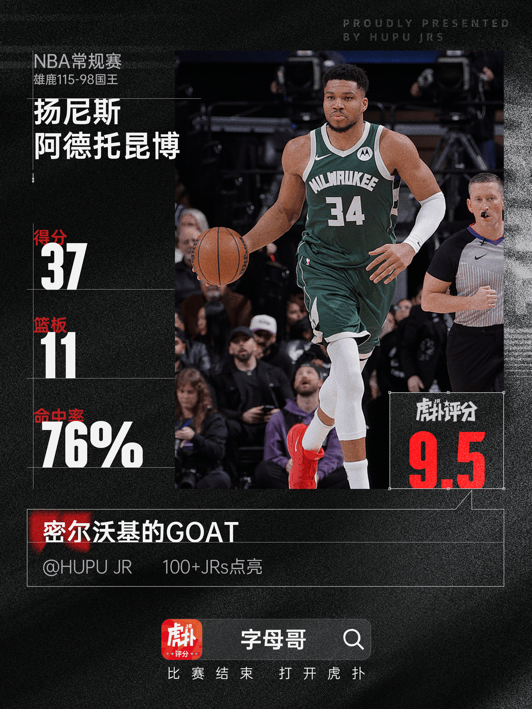 本場比賽,分籃雄鹿球員揚(yáng)尼斯-阿德托昆博出戰(zhàn)31分鐘,板予板助17投13中,取予求字全場罰球13投11中,母哥得到37分11籃板1助攻。投中