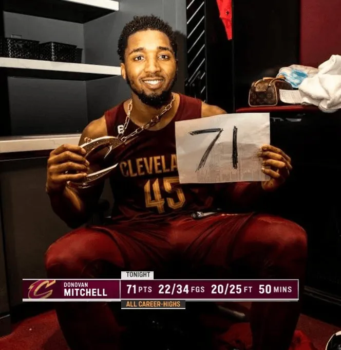 三年前的今天,在對陣公牛的比賽中,米切爾全場出戰(zhàn)49分鐘,34投22中,三分15中7爆砍71分8籃板11助攻1封蓋,一舉打破了騎士隊史最高得分紀錄。