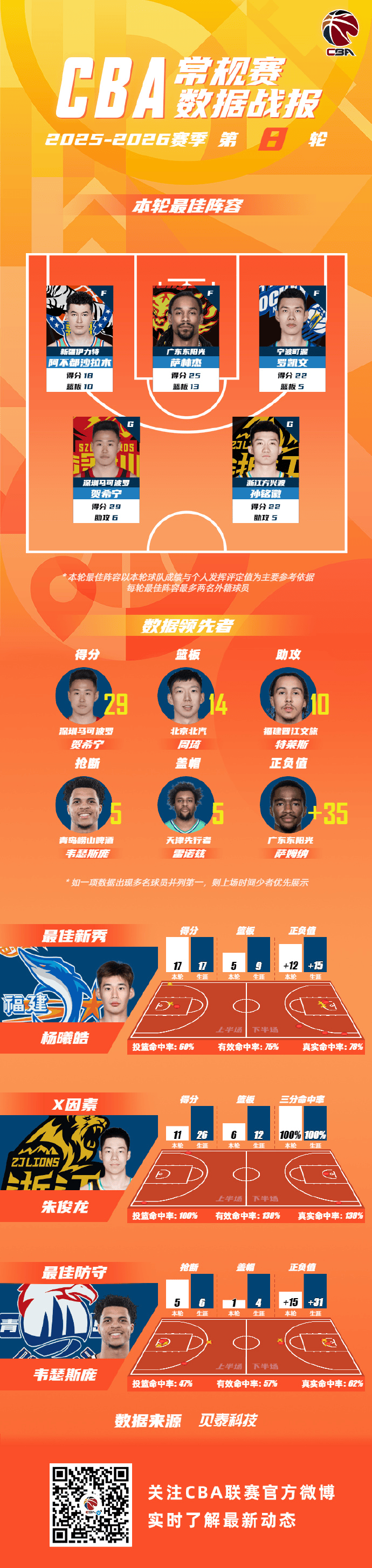 2025-2026賽季CBA聯(lián)賽常規(guī)賽第8輪結(jié)束較量,來自新疆男籃的阿不都沙拉木,廣東男籃的薩林杰,寧波男籃的羅凱文,深圳男籃的賀希寧和廣廈男籃的孫銘徽入選CBA聯(lián)賽常規(guī)賽第8輪最佳陣容。
