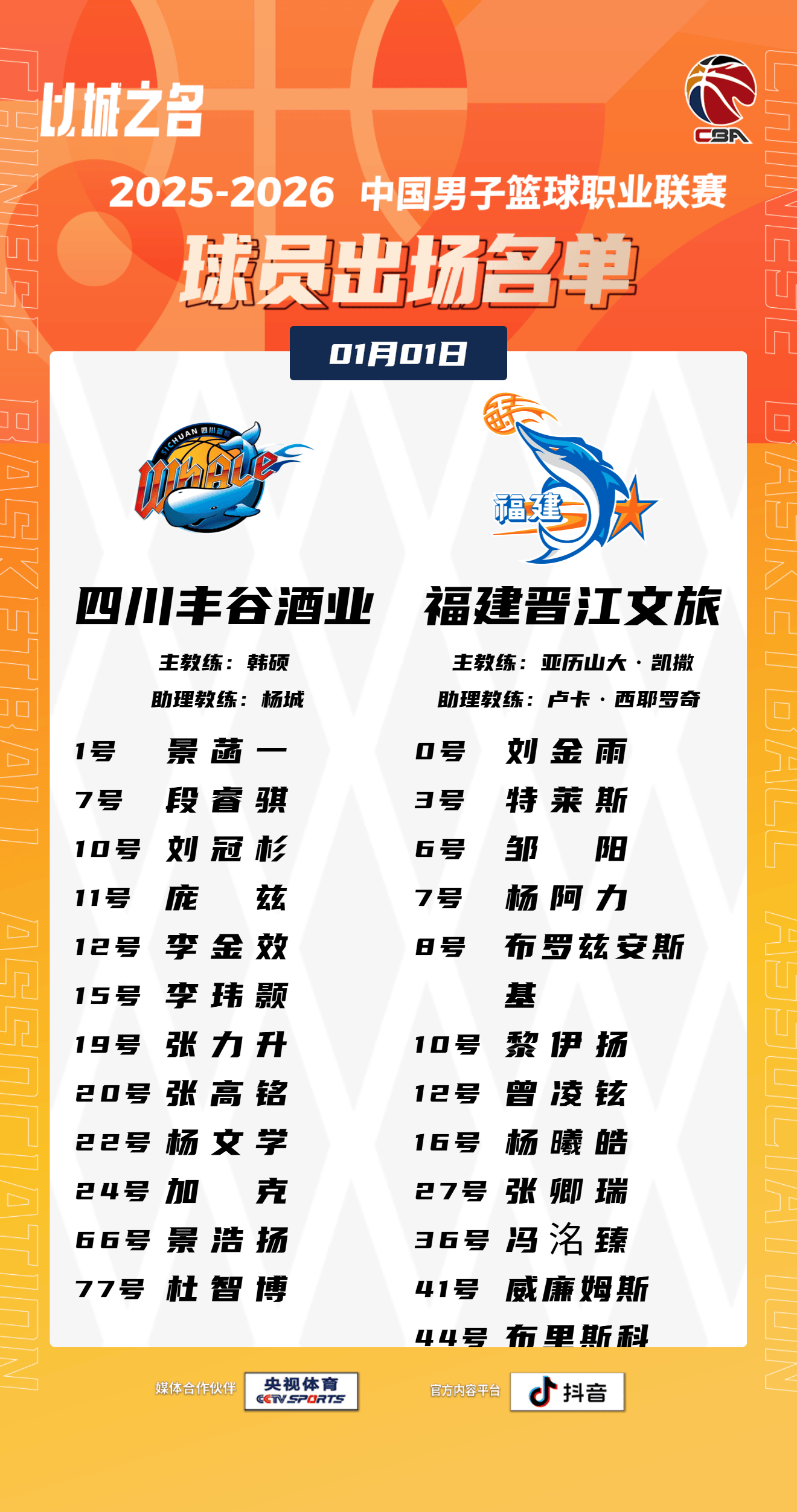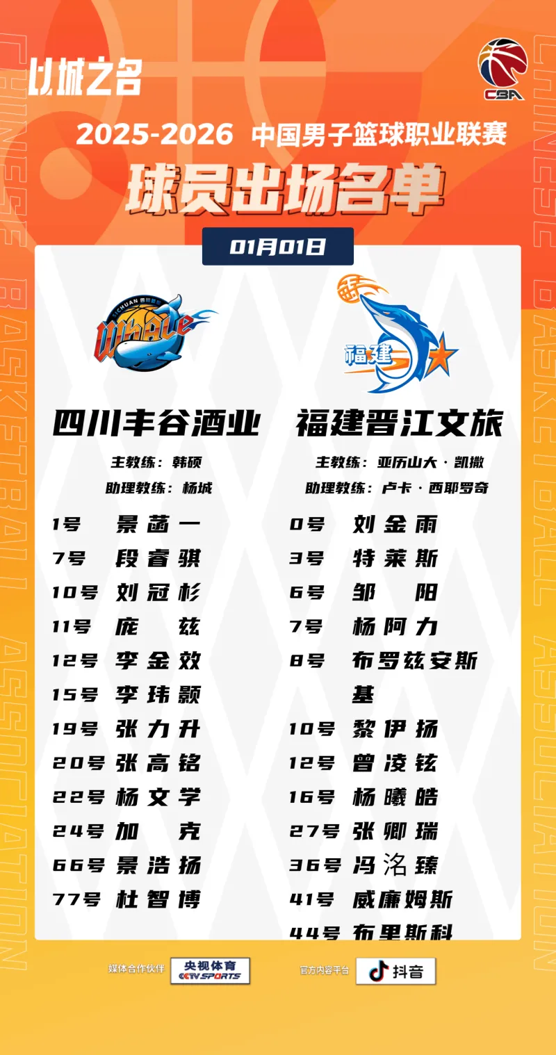 虎撲01月01日訊 今晚CBA常規(guī)賽,四川對陣福建的晚川大名單已經(jīng)公布。