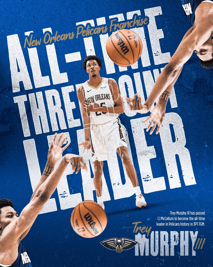 本場比賽后,墨菲鵜鶘生涯共投進696記三分,超越CJ-麥科勒姆,位列隊史第一。