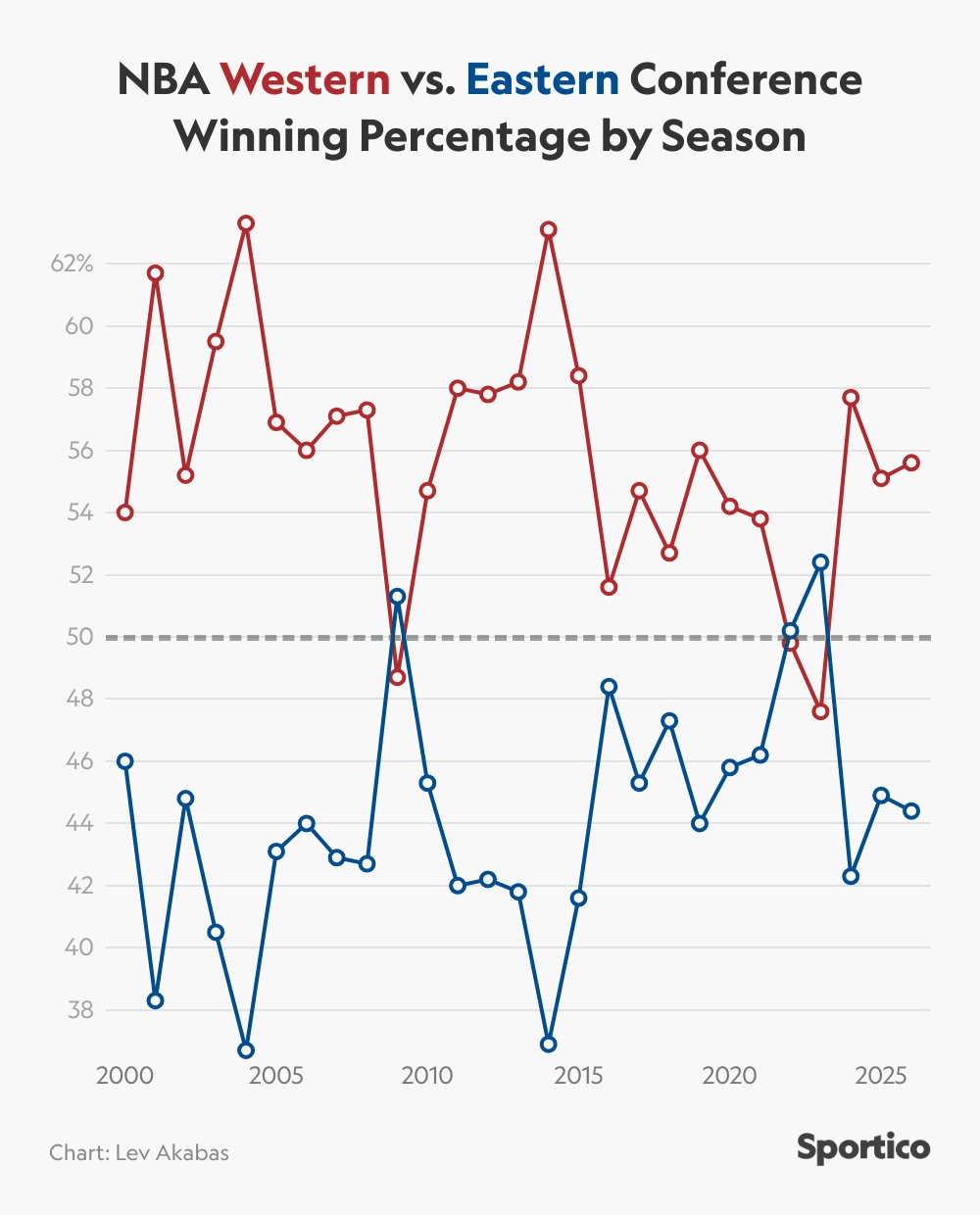 僅在08-09賽季、西部西部20-21賽季、對東21-22賽季,負過東部對陣西部戰(zhàn)績占優(yōu)。去年