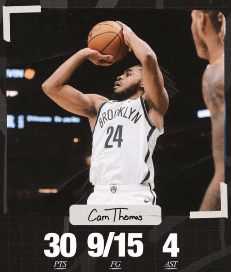 籃網(wǎng)球員卡梅倫-托馬斯全場出戰(zhàn)20分鐘,海報火力15投9中,復(fù)出分助三分8中3、全開全場罰球9中9得到30分3籃板4助攻。