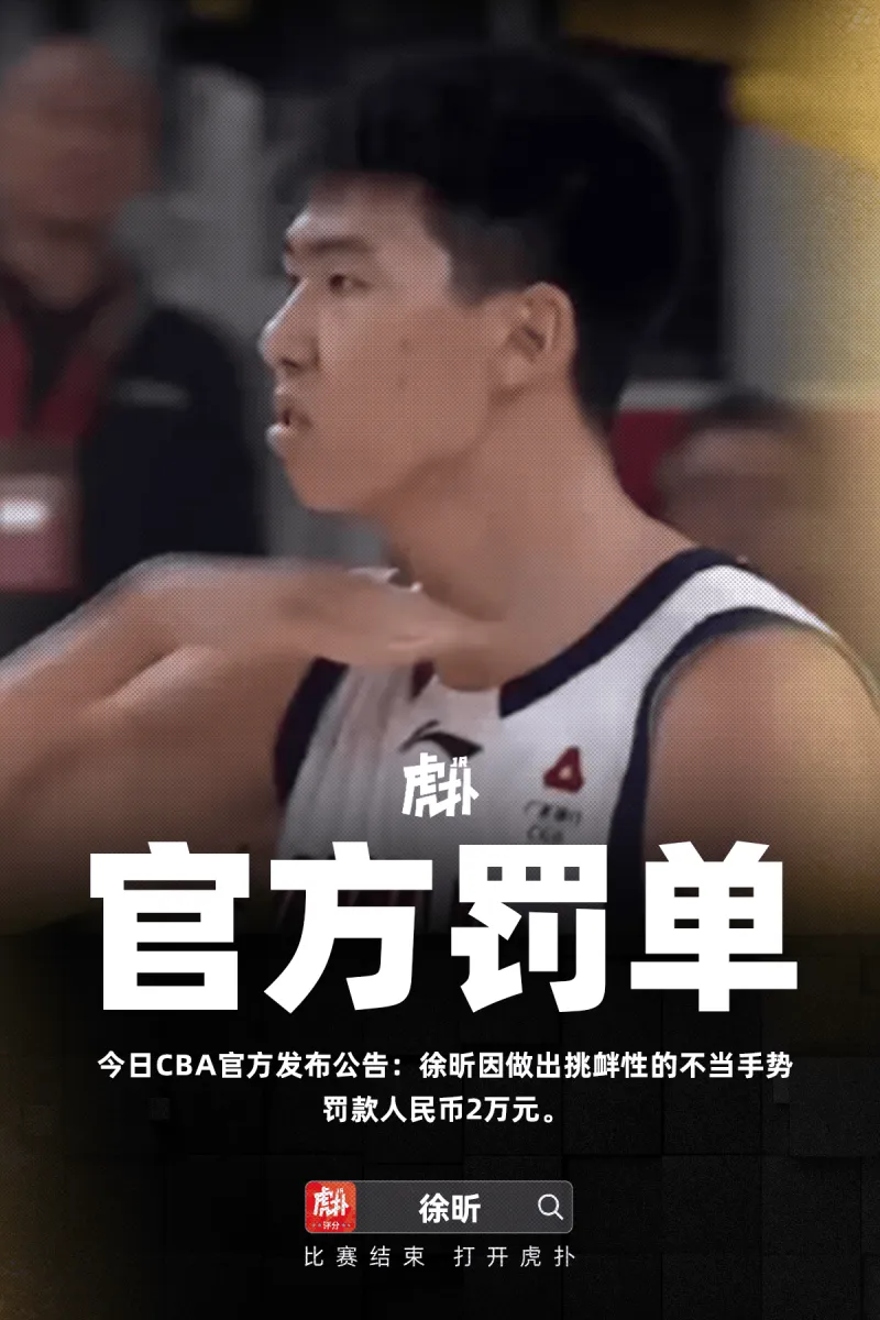 虎撲01月03日訊 今日CBA官方發(fā)布公告:徐昕因做出挑釁性的不當(dāng)手勢(shì),罰款人民幣2萬(wàn)元。出挑
