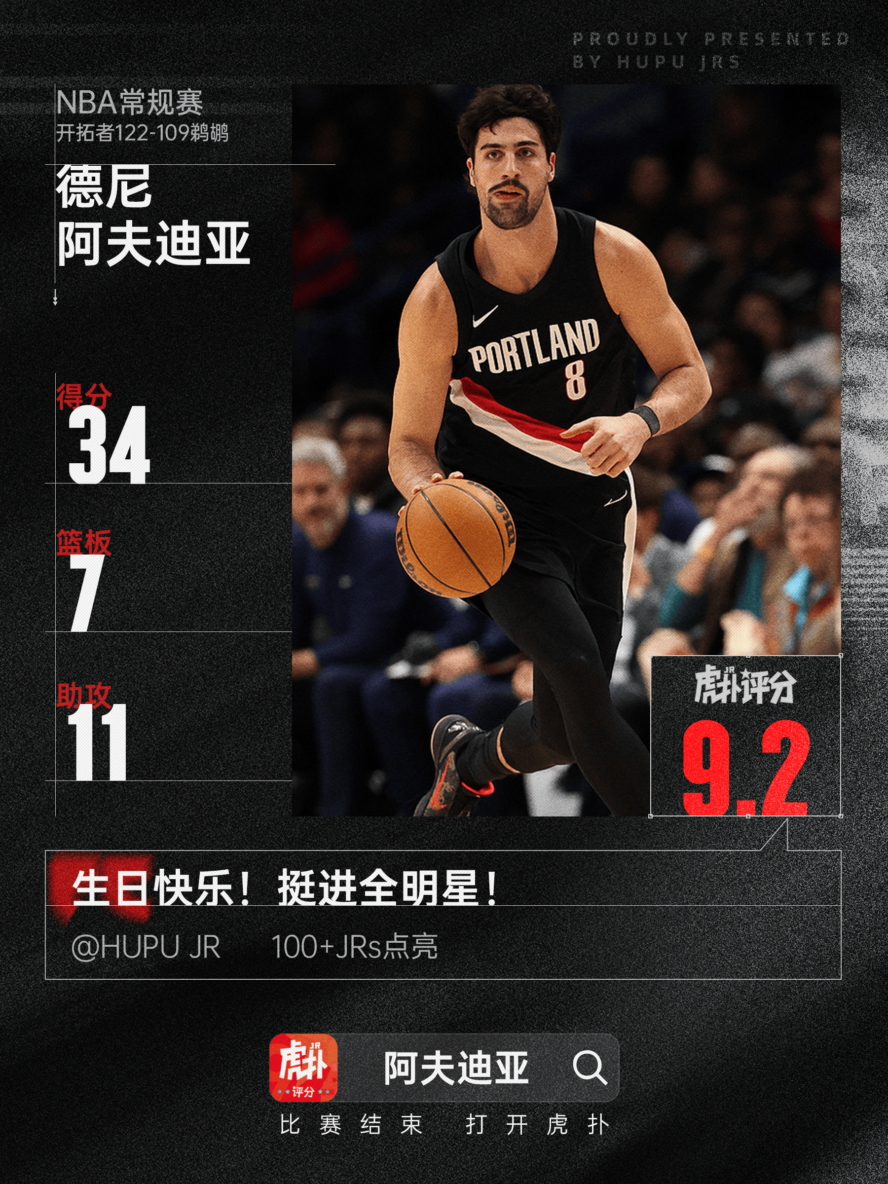 本場(chǎng)比賽,攻搶蓋開(kāi)拓者球員德尼-阿夫迪亞出戰(zhàn)38分鐘,迪亞斷封19投10中,其中三分球5投3中,罰球14投11中,得到34分7籃板11助攻1搶斷1封蓋。