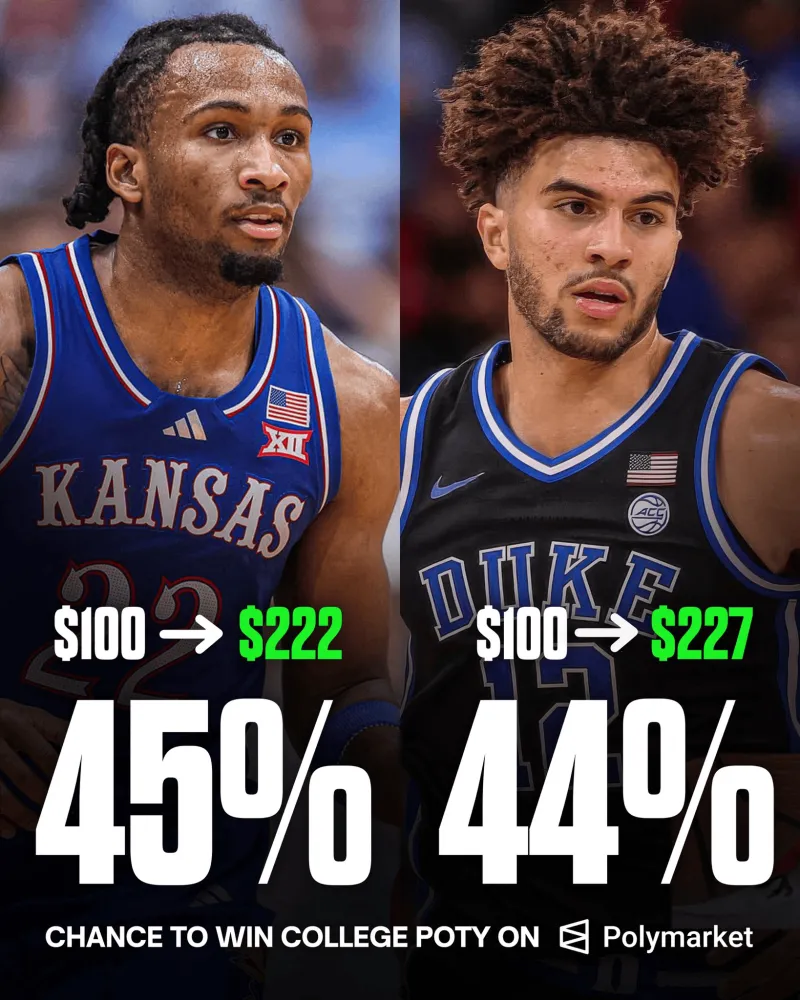 虎撲12月20日訊 今日,賠率網(wǎng)站Polymarket Sports更新動(dòng)態(tài),列出了年度最佳大學(xué)籃球運(yùn)動(dòng)員的兩大熱門人選。