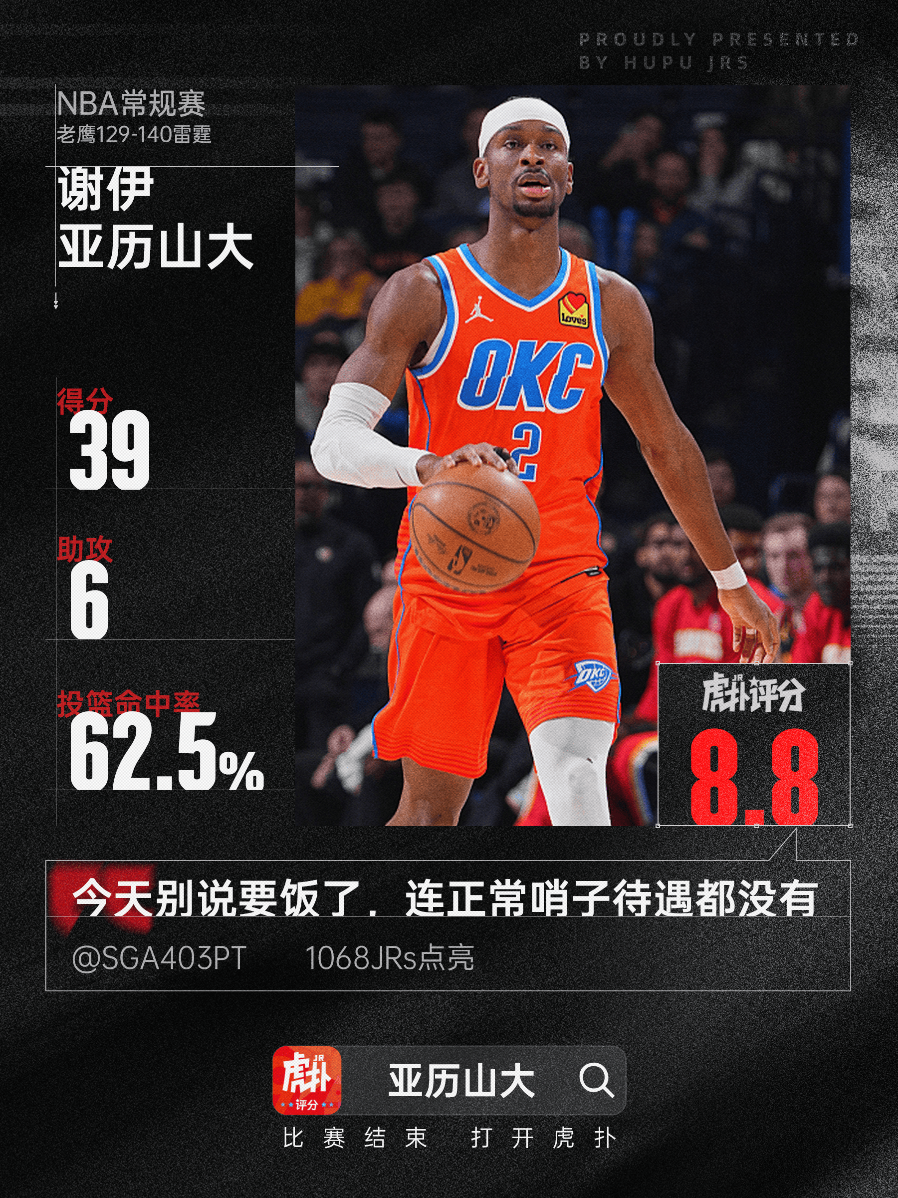 [流言板]亞歷山大全場24投15中、流言歷山籃板三分5中2得到39分5籃板6助攻2搶斷由虎撲籃球資訊 發(fā)表在籃球資訊 https://bbs.hupu.com/502