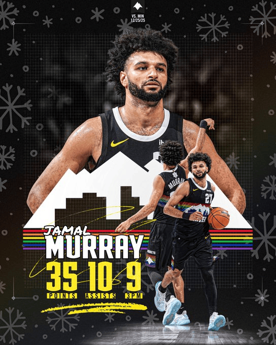 賽后,掘金官方發(fā)布賈馬爾-默里數(shù)據(jù)海報(bào),全場(chǎng)得到35分10助攻,并命中9記三分。