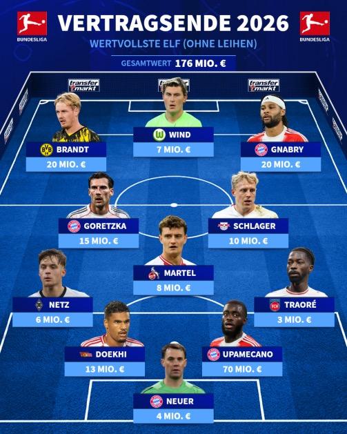虎撲12月30日訊 德轉公布了合同德甲即將在2026年到期的最高身價陣容(不含租借球員)。