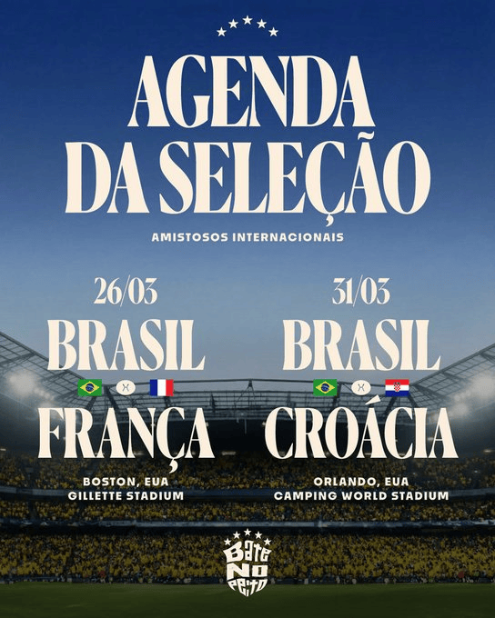 [流言板]巴西官宣友誼賽對(duì)手:3月在美國(guó)先后對(duì)陣法國(guó)和克羅地亞由虎撲足球資訊 發(fā)表在國(guó)際足球資訊 https://bbs.hupu.com/482