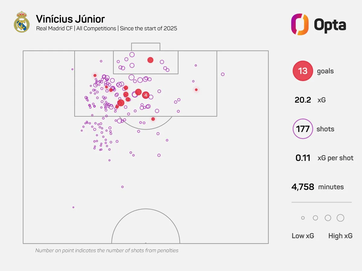 [流言板]2025年以來維尼修斯總進(jìn)球數(shù)低于預(yù)期進(jìn)球7.2球,為西甲最差