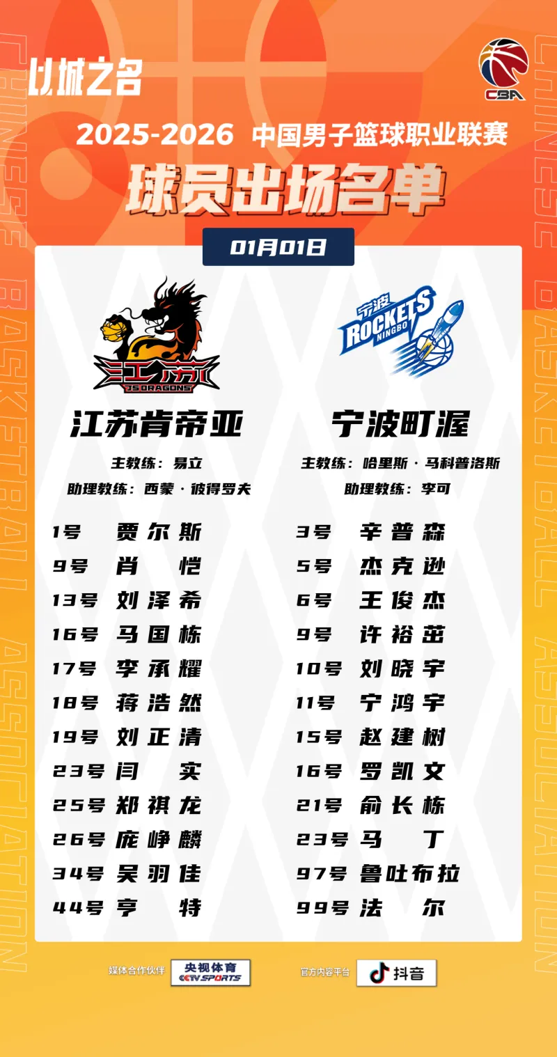 虎撲01月01日訊 今晚CBA常規(guī)賽,江蘇對陣寧波的名單大名單已經(jīng)出爐。