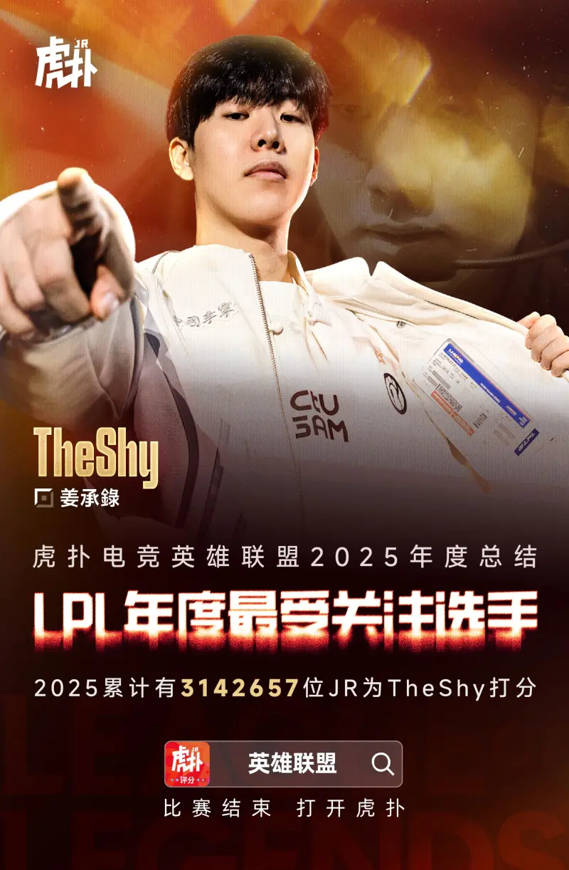 2025賽年共有3142657位JRs為T(mén)heShy打分,是撲最英雄聯(lián)盟賽事中被打分人數(shù)最多的選手