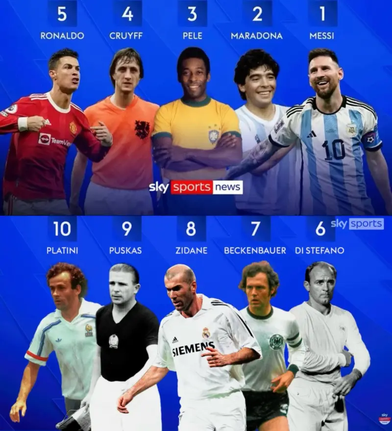 英媒天空體育評選歷史前十:梅西第一,老馬壓貝利,c羅第五,前十無大羅。