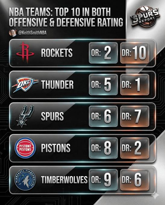 虎撲01月02日訊 今日,據(jù)美記Keith Smith報(bào)道,板賽賽季至今攻防效率值均位列聯(lián)盟前十的季至今攻均位球隊(duì)為: