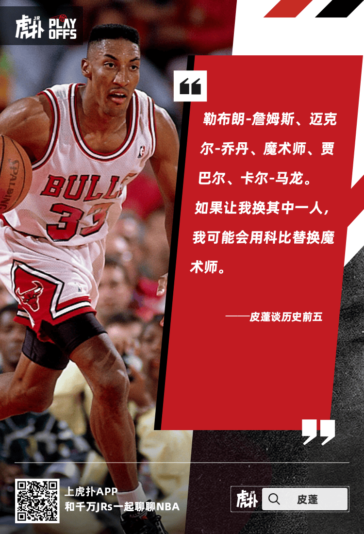 談到自己心目中的歷史前五,皮蓬表示:“勒布朗-詹姆斯、邁克爾-喬丹、魔術(shù)師、賈巴爾、卡爾-馬龍。