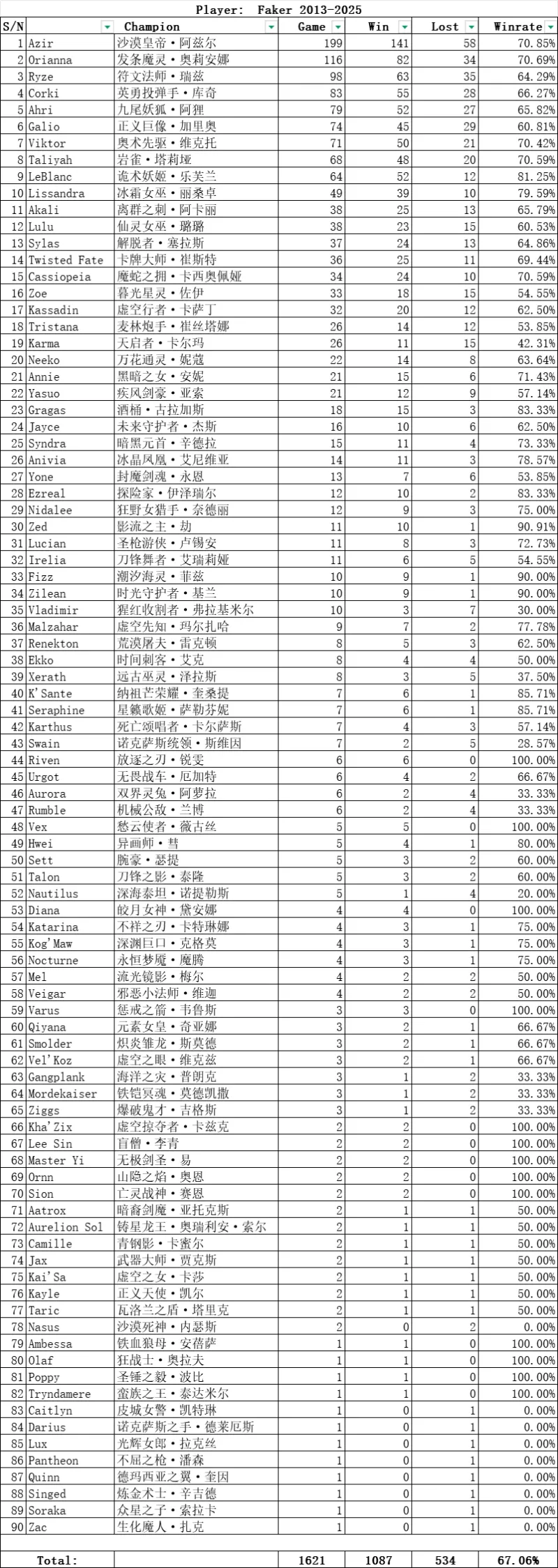 Faker截至2025年全部正式比賽英雄出場數(shù)據(jù)