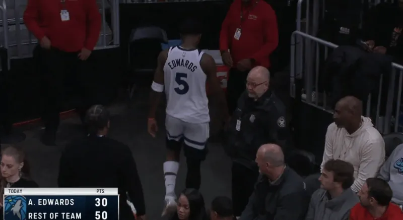 在末節(jié)剩余7分52秒、森林狼落后老鷹29分時,愛德華茲在主帥芬奇叫暫停并換下所有首發(fā)球員后,徑直走向了更衣室。