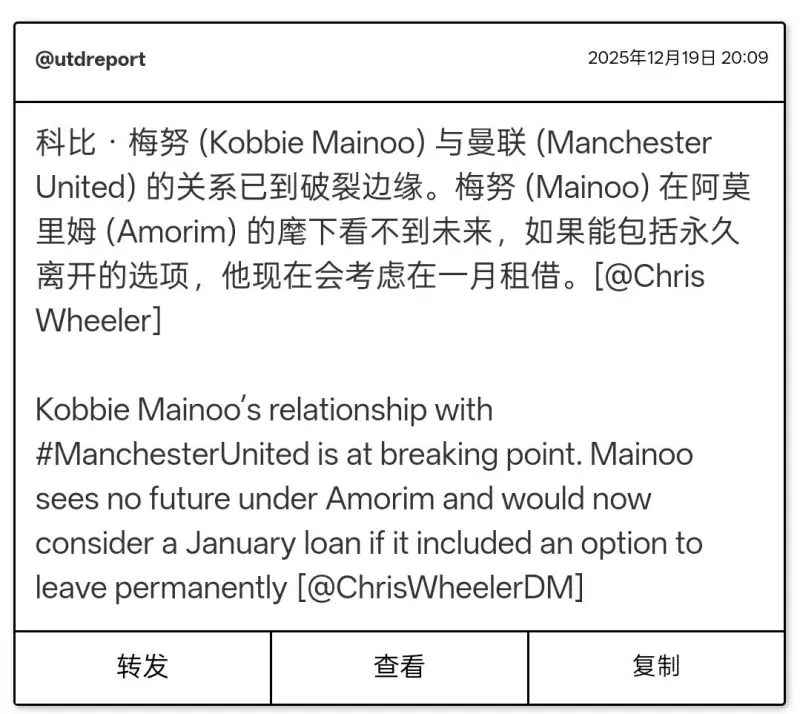 科比?梅努 (Kobbie Mainoo) 與曼聯(lián) (Manchester United) 的關(guān)系已到破裂邊緣。梅努 (Mainoo) 在阿莫里姆 (Amorim) 的關(guān)到破麾下看不到未來,如果能包括永久離開的系已選項,他現(xiàn)在會考慮在一月租借。裂邊[@Chris 梅努曼聯(lián)Wheeler]