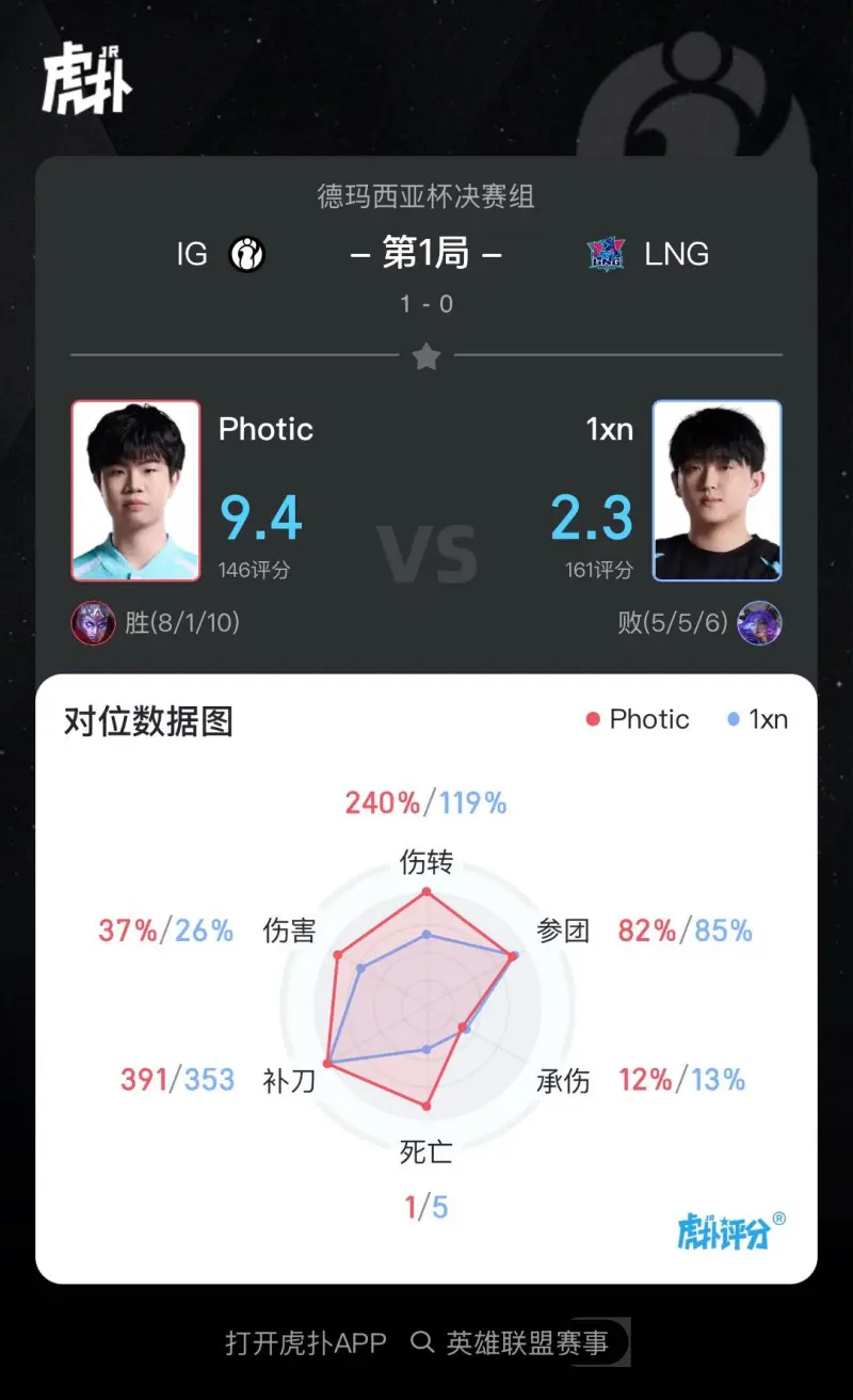虎撲01月01日訊 在剛剛結(jié)束的LNG對陣IG的對局中,Photic使用韋魯斯打出8/1/10戰(zhàn)績,打出對陣G第斬獲IG對陣LNG第一局MVP