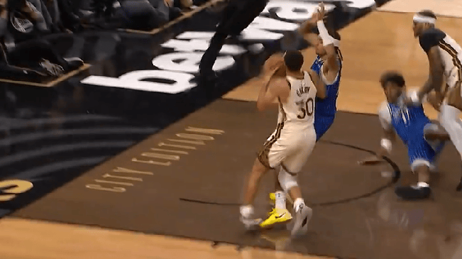 第二節(jié)比賽,飛身庫里加速突破飛身上籃崴腳,上籃賽簡(jiǎn)單調(diào)整后繼續(xù)比賽。崴腳