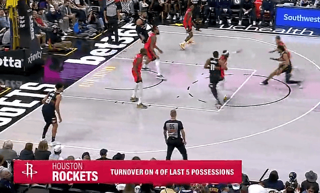 [流言板]杜蘭特被搶斷,火箭在過(guò)去的5個(gè)回合當(dāng)中出現(xiàn)4次失誤