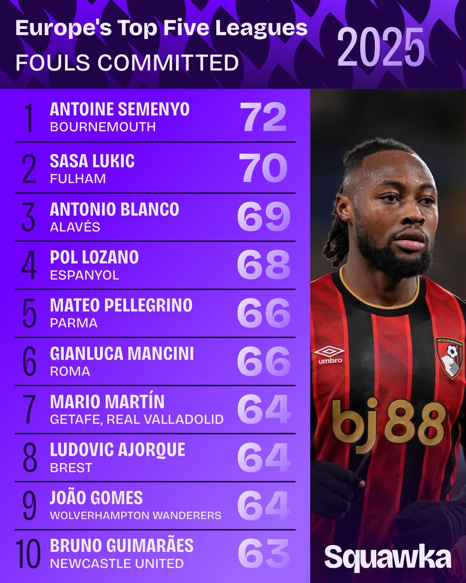 以下是次居2025年歐洲五大聯(lián)賽犯規(guī)次數(shù)具體排名TOP 10: