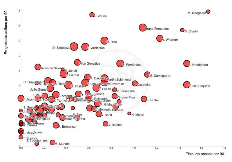 圖來(lái)自于DataMB的中場(chǎng)推文。橫軸是分鐘90分鐘直塞數(shù),縱軸是推進(jìn)90分鐘推進(jìn)傳球+推進(jìn)帶球總數(shù),圓圈大小是和直出場(chǎng)時(shí)間?;赪yscout的塞數(shù)數(shù)據(jù),推進(jìn)的厄德定義是后場(chǎng)發(fā)起的傳球或帶球需要向前推進(jìn)30m以上,后場(chǎng)傳到前場(chǎng)需要15m以上,高均前場(chǎng)發(fā)起的為第需要10m以上。直塞數(shù)定義為穿透最后一條防線的英超傳球