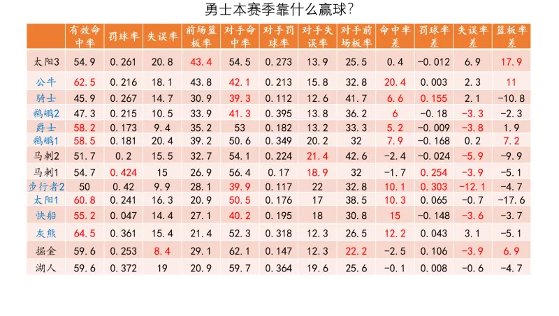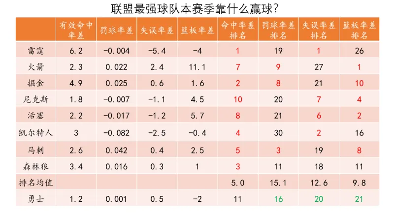 看完勇士隊(duì)內(nèi)、我們再來看本賽季聯(lián)盟最強(qiáng)的8支球隊(duì)他們的攻防四要素情況,從上圖中可以看到這8支球隊(duì)首先都是命中率差排名前10的球隊(duì),雙方把握機(jī)會(huì)的能力差距依然是決定比賽關(guān)鍵的最重要因素。而勇士本賽季至今在命中率差上的排名為第11名、差一步能夠邁進(jìn)強(qiáng)隊(duì)的門檻,所以至少目前不算是最大的問題。