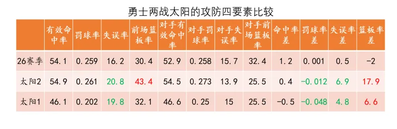 而在第2次面對太陽時(shí),勇士依然在有效命中率上并未明顯領(lǐng)先太陽,失誤率差甚至比第1場還要更多。唯一的區(qū)別在于這一次勇士造成的籃板率差更加恐怖,43.4%的單場前場籃板率終于能夠媲美斷檔領(lǐng)先的火箭了。而如果看整個(gè)賽季的表現(xiàn),得益于勇士出色的防守以及對手三分運(yùn)氣較差、勇士在命中率差這一項(xiàng)上還領(lǐng)先對手。但問題在于籃板率部分輸給對手2%、失誤率比對手高出0.5%,這還是在勇士球員非常積極的造成對手大量失誤的背景下。所以勇士真正的病根在于球權(quán)爭奪上,特別是控制自身失誤以及籃板保護(hù)兩個(gè)方面。
