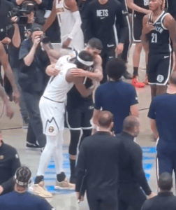 賽后,邁克爾-波特與掘金前隊(duì)友們擁抱。