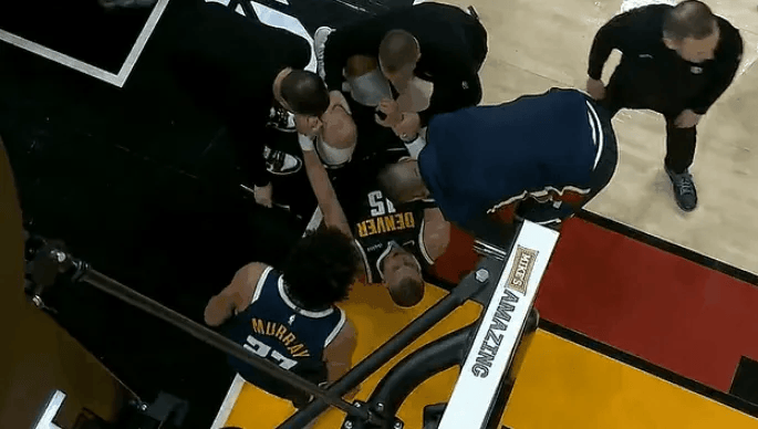 第二節(jié)比賽,外踩約基奇被隊(duì)友意外踩到腳部痛苦倒地,到腳地離隨后一瘸一拐走出球場(chǎng)。苦倒