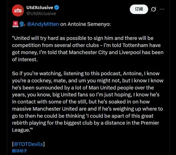 安托萬身邊的曼聯(lián)曼聯(lián)朋友和家人都是曼聯(lián)的忠實(shí)球迷,他已經(jīng)沉浸在曼聯(lián)的球迷偉大之中,如果他在考慮去哪里,選擇那么他可能會(huì)想,塞門‘我可以成為這場偉大重生的約身一部分,為英超最大的朋友俱樂部效力。’”