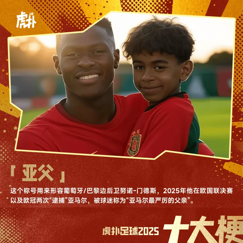 這個稱號用來形容葡萄牙/巴黎邊后衛(wèi)努諾-門德斯,2025年他在歐國聯(lián)決賽以及歐冠兩次“逮捕”亞馬爾,被球迷稱為“亞馬爾最嚴(yán)厲的父親”。