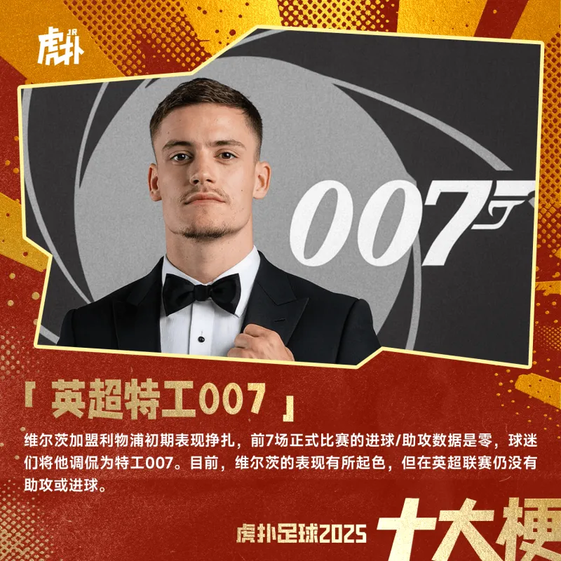 維爾茨加盟利物浦初期表現(xiàn)掙扎,前7場正式比賽的進(jìn)球/助攻數(shù)據(jù)是零,球迷們將他調(diào)侃為特工007。目前,維爾茨的表現(xiàn)有所起色,但在英超聯(lián)賽仍沒有助攻或進(jìn)球。