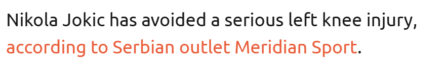 記者Djordje Matic在報道中援引接近丹佛方面的消息稱,掘金對約基奇遭遇的傷情,給出了積極反饋,相關(guān)消息稱他的膝蓋并未遭遇嚴重損傷。