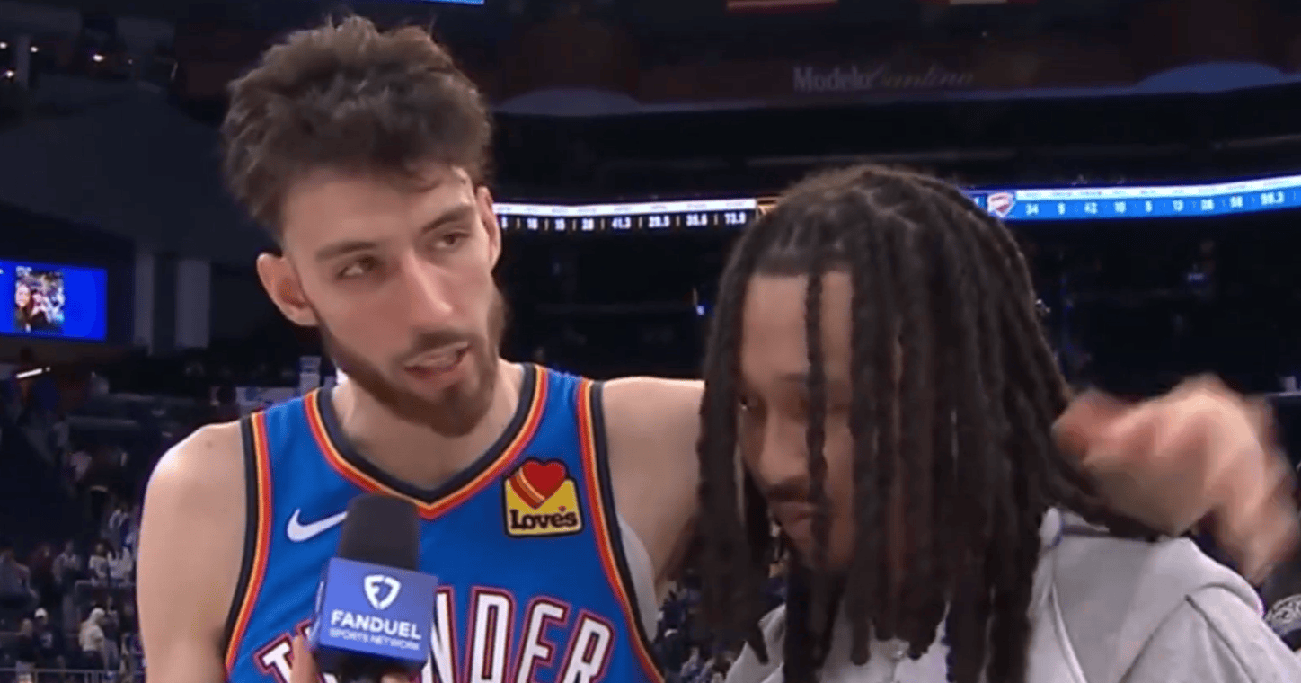 賽后,雷霆球員切特-霍姆格倫接受了記者采訪。