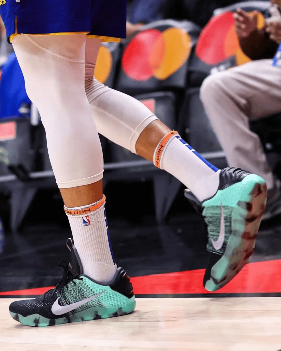 比賽中,庫(kù)里上腳全明星配色Nike Kobe 11 Elite Low。