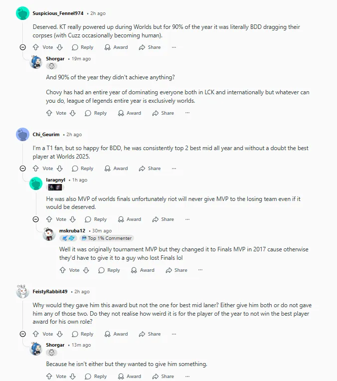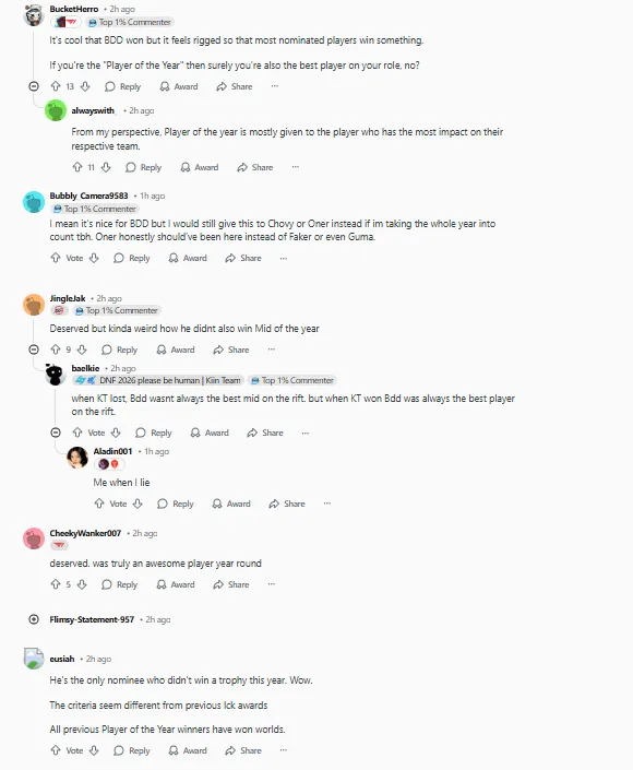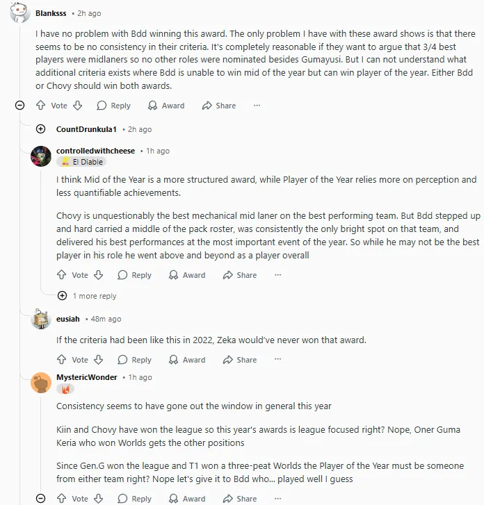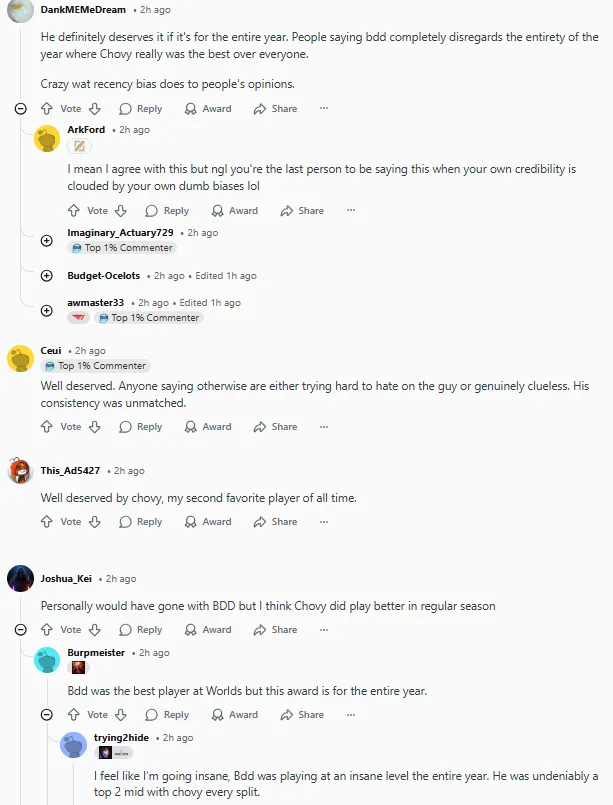 如果這是針對全年表現(xiàn)的獎項,他絕對配得上。那些說Bdd的人完全忽視了Chovy全年都比其他人表現(xiàn)更好的事實。