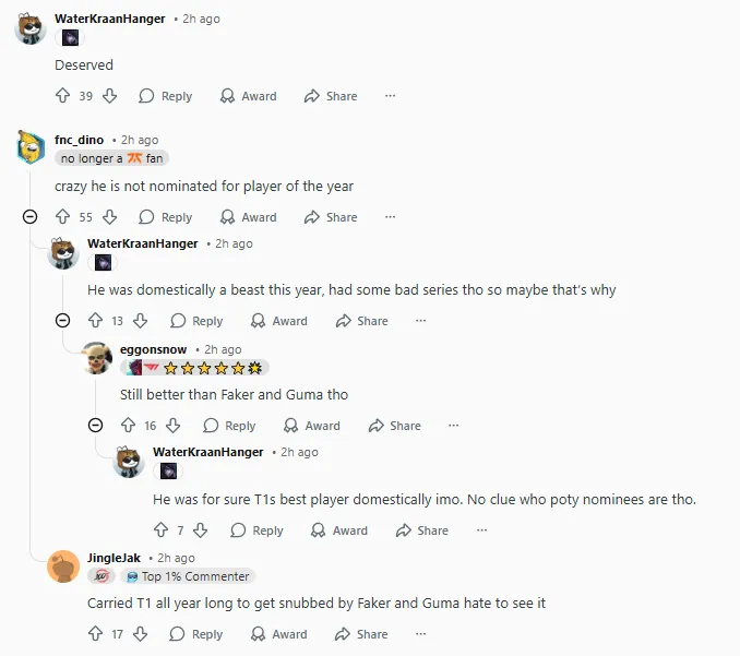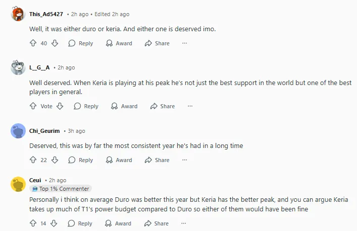 就我個人而言,我認(rèn)為Duro本賽季的平均表現(xiàn)更好,但Keria的巔峰狀態(tài)更出色。而且你可以說Keria占據(jù)了T1極大的戰(zhàn)術(shù)比重,遠(yuǎn)超Duro,所以他們兩人中的任何一個獲獎都可以。