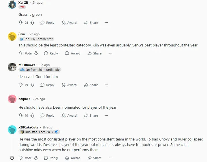 這是最具爭議性最小的一個獎項了。Kiin甚至可以說是GenG全年表現(xiàn)最好的選手。