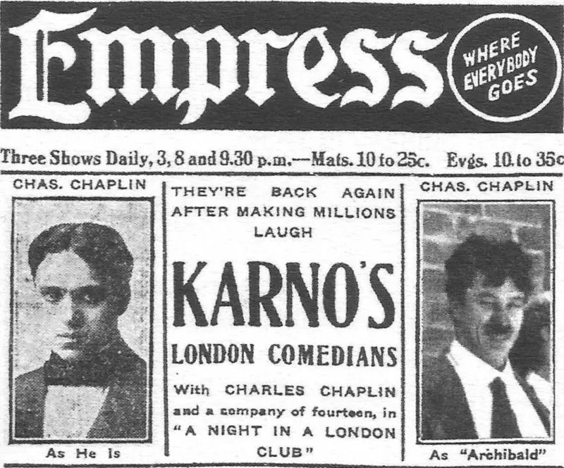 ▲ 1913年卓別林與弗雷德·卡諾Fred Karno喜劇公司的美國(guó)之旅廣告