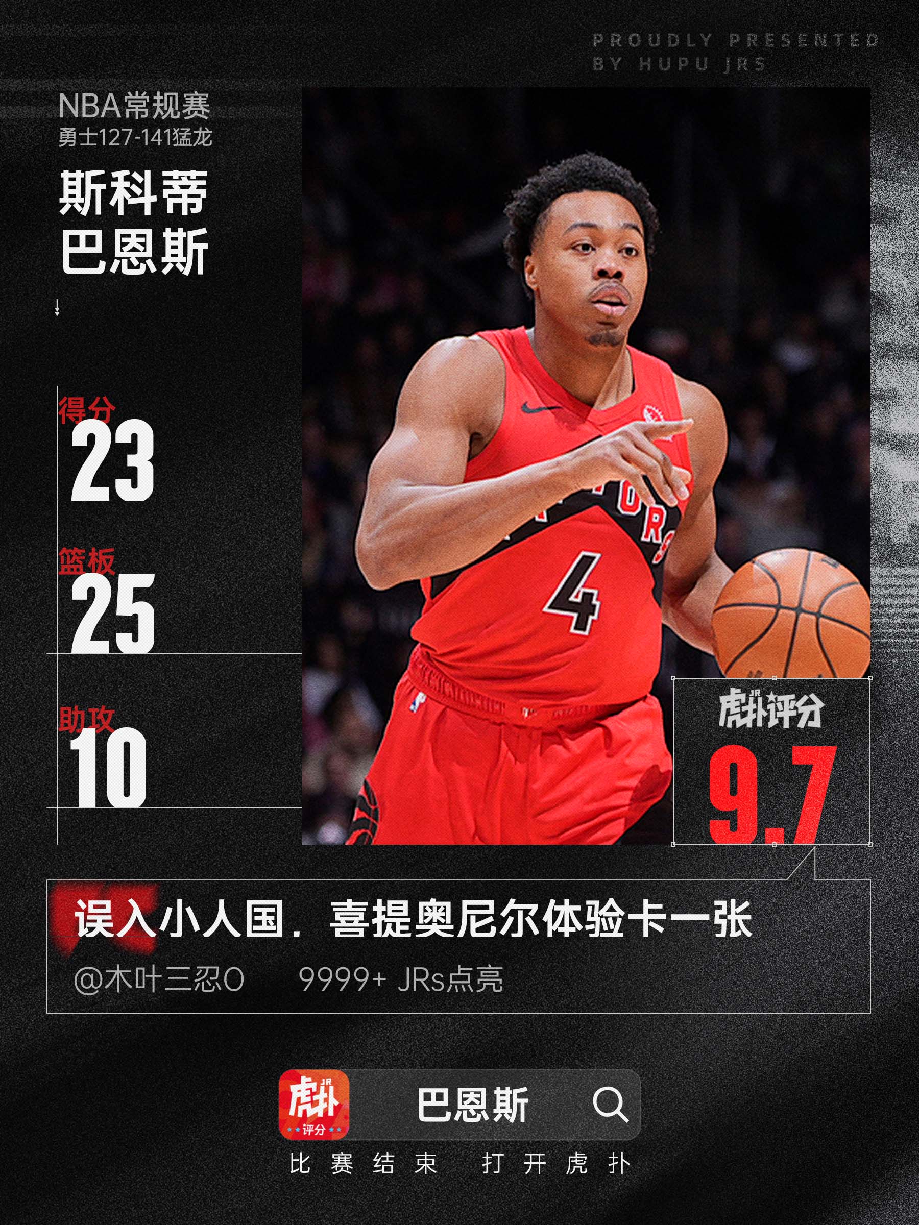 猛龍球員斯科蒂-巴恩斯全場(chǎng)出戰(zhàn)42分鐘,分籃17投11中,攻搶三分1中0、板搶爆勇板助罰球1中1得到23分25籃板10助攻3搶斷1蓋帽,士巴其中25籃板為個(gè)人職業(yè)生涯新高。全場(chǎng)