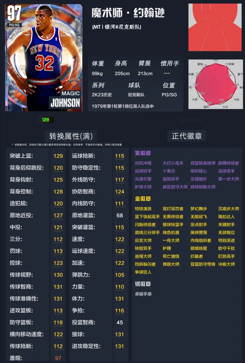 206大模型(pg/sg),從nba2k系列上線以來,最強(qiáng)最好用的控衛(wèi)選擇。去年的喬丹,已經(jīng)是ol2王朝pg、街頭1號位最bug的存在,沒有之一。同突破新情況對位下,攻防兩端都碾壓了其他球員。因此想結(jié)束目前這個(gè)喬丹壟斷的游戲,策劃也會這次上線一張同位置的 限制牌和對壘牌。結(jié)合歷史地位,同位置球員人選,魔術(shù)師就是最佳的選擇。策劃在今年夏天毫無征兆的緊急加強(qiáng)了運(yùn)球好手,受益的球員看似喬丹是最大的贏家,實(shí)則也是在給年底有可能的魔術(shù)師的一個(gè)提前售前,魔術(shù)師的206大模型,除了鎖死對面,也能加冕這個(gè)23內(nèi)核尾巴里,最強(qiáng)的推人之王。再考慮到最近數(shù)據(jù)更新,加強(qiáng)程度最大的現(xiàn)役球員亞歷山大,這個(gè)版本又加了金色的無畏終結(jié)者增加了假球觸發(fā),全段位的玩家都被推到人麻了。于是在這個(gè)23內(nèi)核的尾巴,想要最大程度的限制喬丹鴨梨為首的推人流,玩家的球隊(duì)里可以購入一張屬于你評分段位的,不同突破等級的魔術(shù)師,這個(gè)魔術(shù)師也必定從1突(100評分左右)到7突(136評分左右)都是很好用的陳列室。