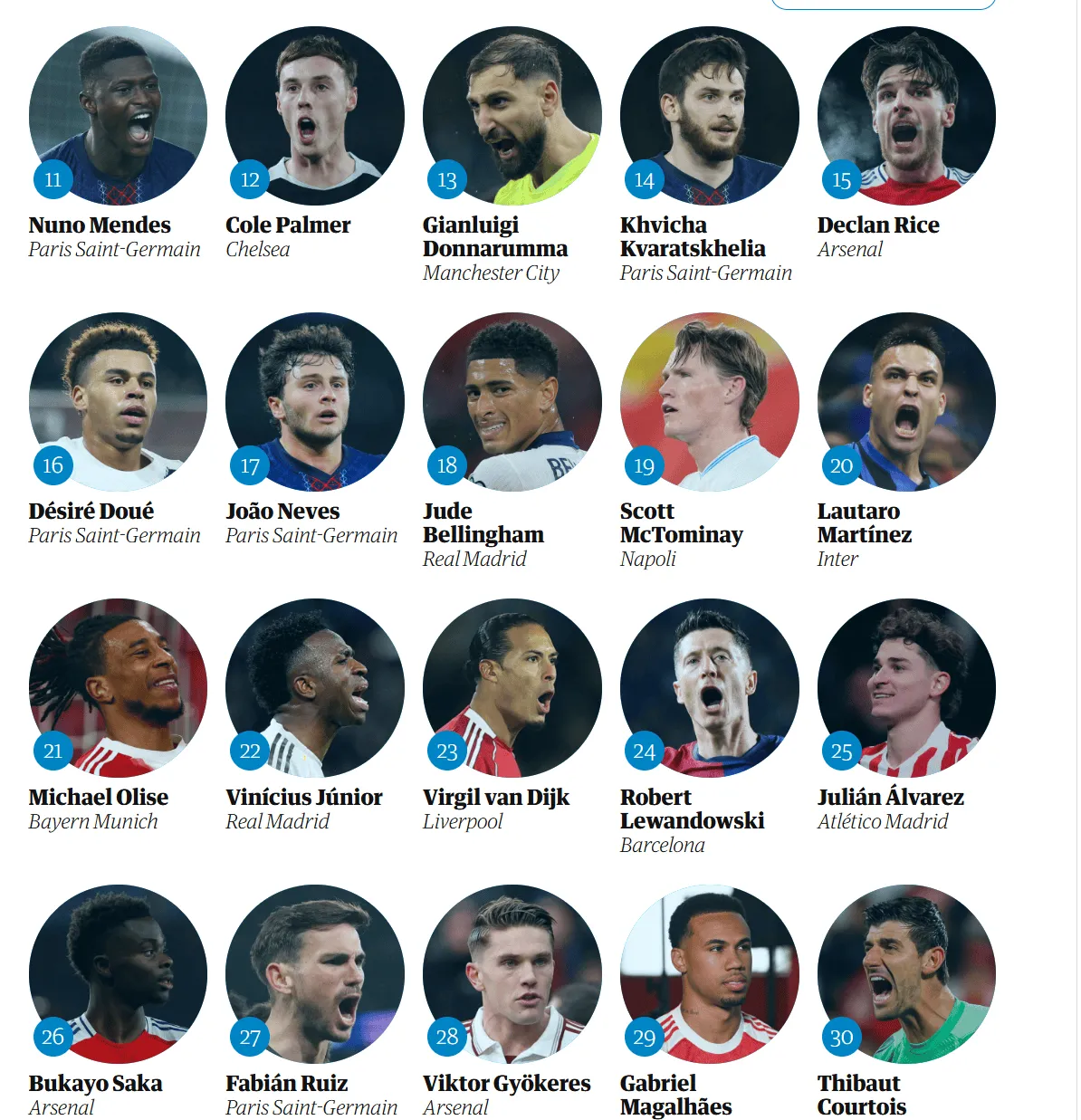 衛(wèi)報2025百大球星71-100名:居萊爾71、板衛(wèi)報百羅德里74、大球諾伊爾94